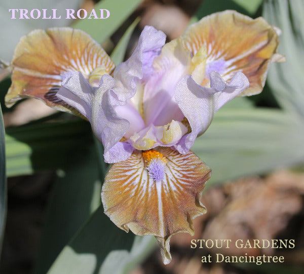 S. light blue, washed light tan, lemon-yellow veins, based dark blue-violet; style arms lemon-yellow, lavender midrib and lip; F. dark khaki brown, intermittent grey edge, white starburst at beard, white fading dart from beard ¾ down petal; beards based delta blue, tips yellow in throat.