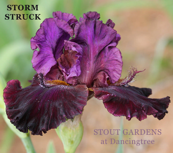 S. amethyst; style arms plum; F. plum purple; beards squirrel brown, big plum-purple spoons; looping ruffles; flared; slight spicy fragrance.