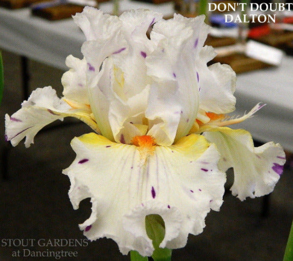 S. pure white, red-purple random splattering; style arms white, washed gold; F. pure white, yellow-gold washed hafts, random dark purple splatters; beards poppy orange, tattered and feathered white horns, gold stems; flared and ruffled.