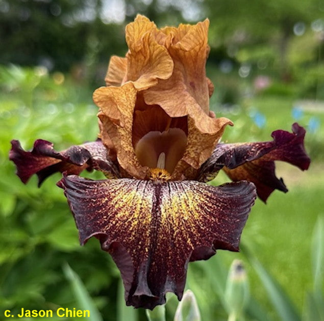A beautiful fancy plicata patterned iris from youth Jason Chien of Missouri, his first introduction! Rich burgundy patterns on creamy yellow ground look awesome on well proportioned stalks. Congrats Jason!