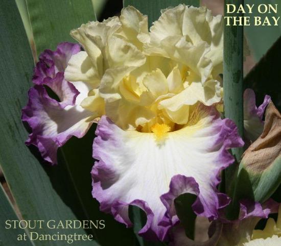 Flowers; S. creamy lemon yellow; F. white, wide violet band that bleeds toward center; beards gold.