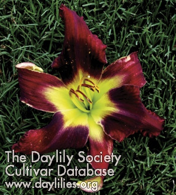 height 40 inches (102 cm), bloom 7 inches (18 cm), season E, Rebloom, Dormant, Tetraploid, 30 buds, 6 branches, Unusual Form Crispate-Cascade, Dark red with darker eye above lime green throat. (sdlg × sdlg)