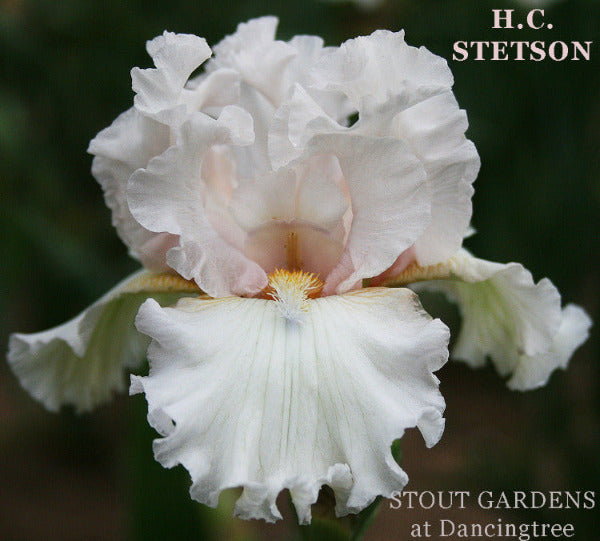 Flowers: Ruffled very pale pink, deepening at midrib and base; beards pale blue with hairs tipped white, all-white in center, pale pink in throat; slight sweet fragrance.