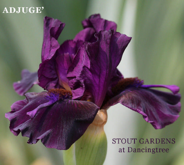 Dark pink violet standards. Falls deep dark violet with elongated horn with spoon. Limited.