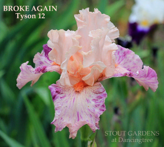 S. peach pink; style arms peach; F. pink purple, purple violet splashes; beards tangerine-shrimp, occasional short, upturned fuzzy light pink horns; broken color pattern.