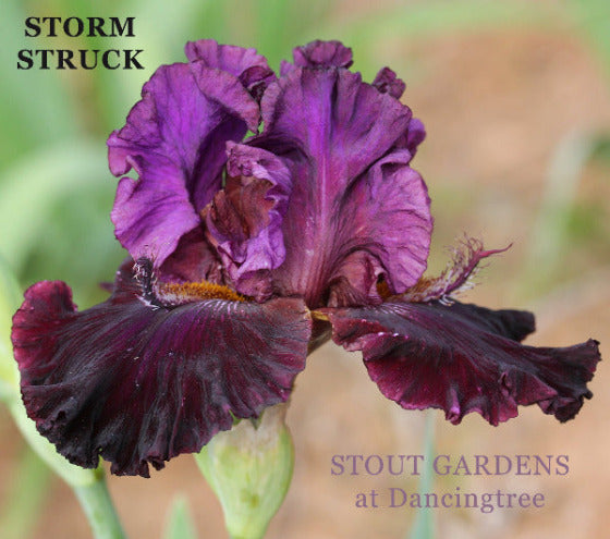 S. amethyst; style arms plum; F. plum purple; beards squirrel brown, big plum-purple spoons; looping ruffles; flared; slight spicy fragrance.